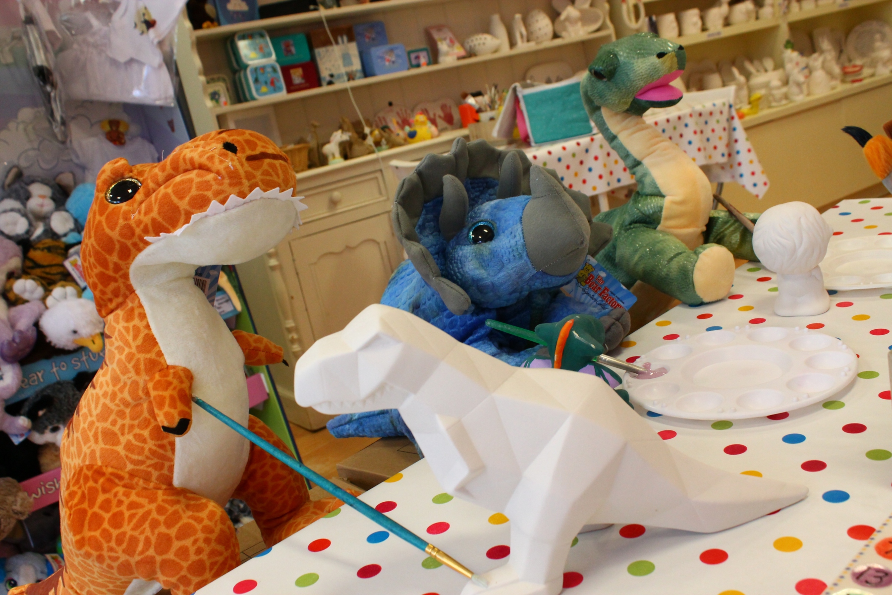 Make-A-Bear Dinosaur Selection having fun at a Dinosaur pottery painting party